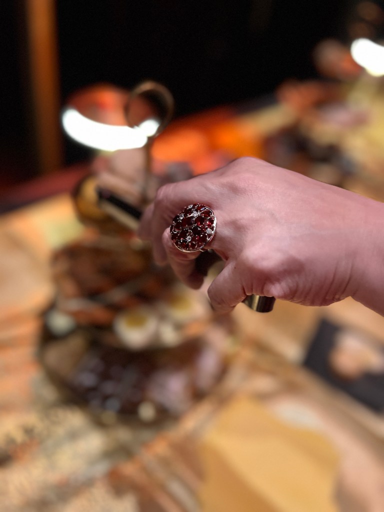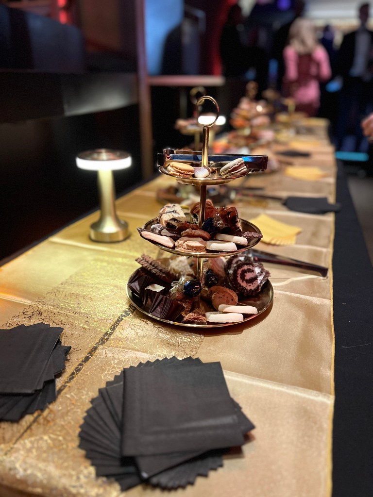 Another showstopper was the pastry arrangement. European-styled wafers, tea cookies, and bundt cakes satiated a hungry crowd. Several of the night’s best dressed beelined for the dark chocolate bon bons (a great pairing with sparkly champaign, by the way). M.J, a local fed, modeled a couture fit floral dress that uniquely gave Hollywood vibes.