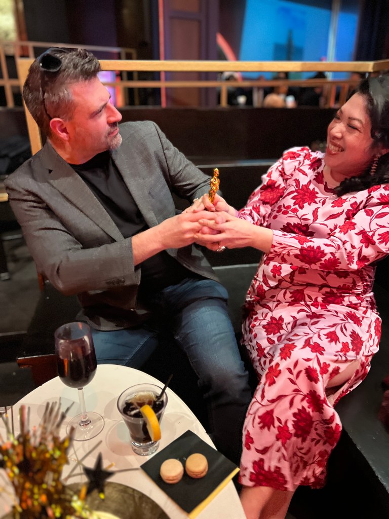 “I know the fan favorite to win is Zoe Saldana but Ariana Grande nailed it. She made Wicked a wonderful movie to watch. Quite frankly, I think she’s way better than Zoe.” Dean has watched most of the movies that were nominated, and expounded highlights from several of this year’s nominees. When the main tv by the bar had a minor glitch, Dean shared his phone with attendees so they can watch Adam Sandler dressed in a comfy sweatshirt swear his love for Timothy Chalamet. Dean saved the day for many movie-goers.